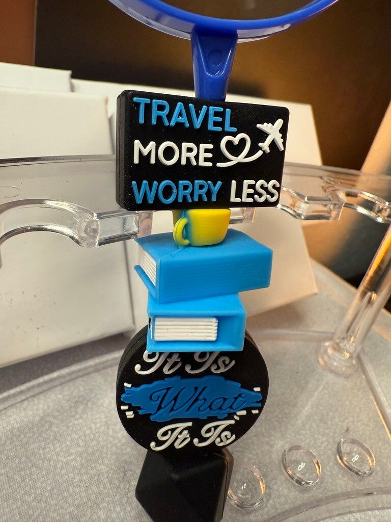 “Travel More, Worry Less” charm with an airplane icon ✈️