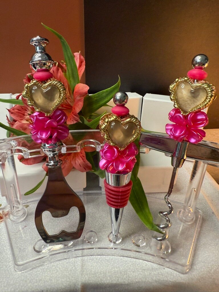 Bring beauty and charm to your bar with this handcrafted 3-piece bar tool set, designed with a glamorous touch. Each piece features a golden heart centerpiece framed with a radiant finish, paired with vibrant pink floral accents for a bold, elegant look. Perfect for entertaining or gifting, this set combines practicality with decorative style.