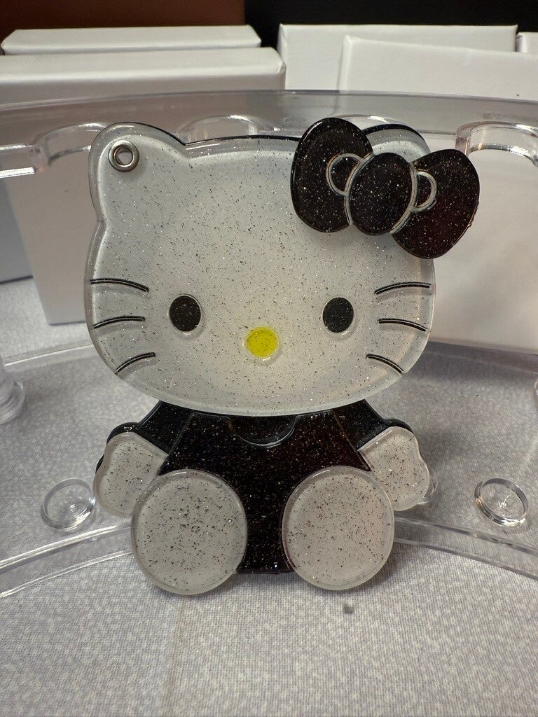 Add a touch of sparkle and cuteness to your everyday routine with this Hello Kitty glitter compact mirror! Shaped like Hello Kitty herself, this mirror features a shimmery black-and-silver design with a bow accent. The front is a decorative piece, and the head flips open to reveal a convenient mirror inside.