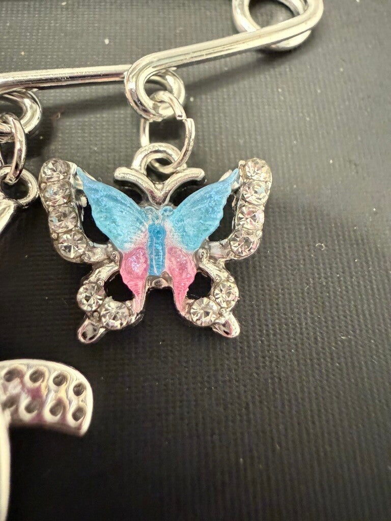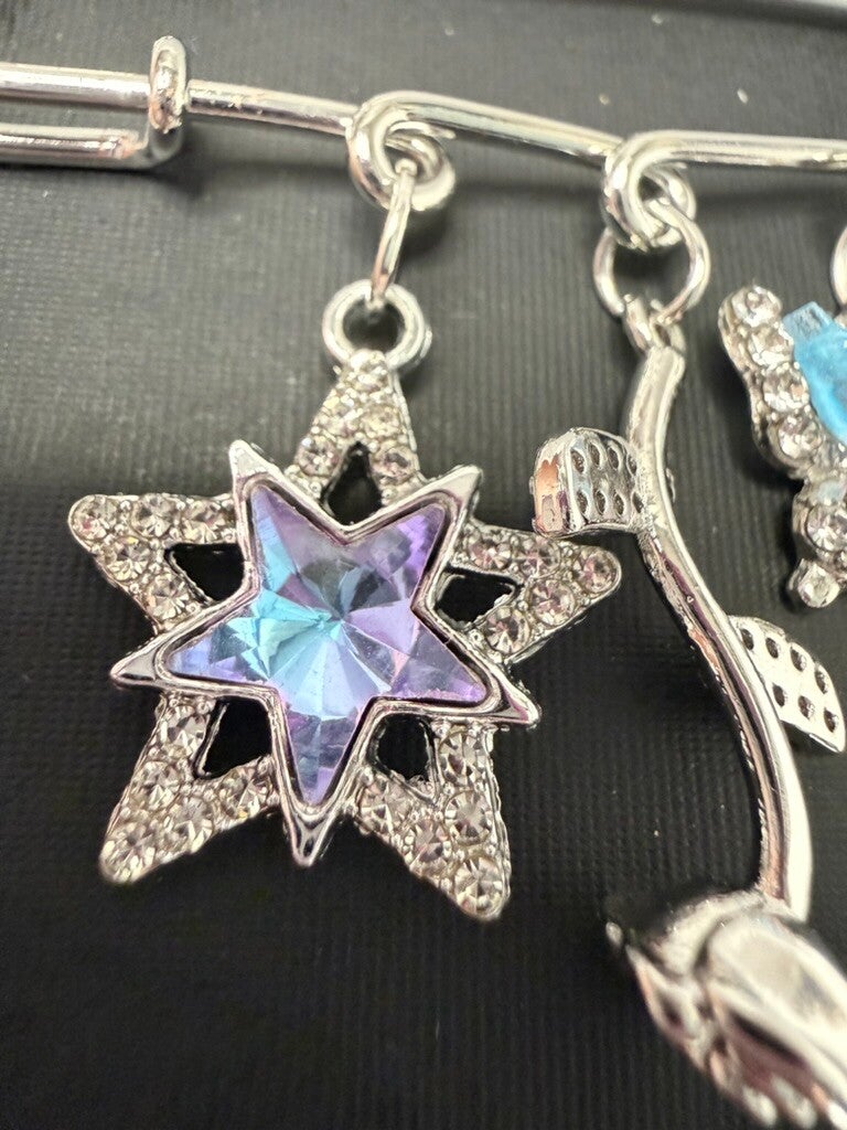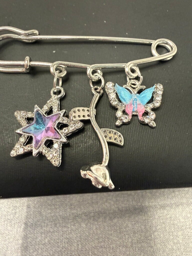 Add a touch of sparkle and whimsy with our Celestial Bloom Charm Pin, a radiant mix of elegance and charm. This silver-tone safety pin features three stunning pendants: a shimmering purple-blue crystal star, a sparkling rose stem, and a pastel butterfly accented with rhinestones. Perfect for adorning jackets, scarves, hats, or handbags, this versatile piece brings both style and personality wherever it goes.