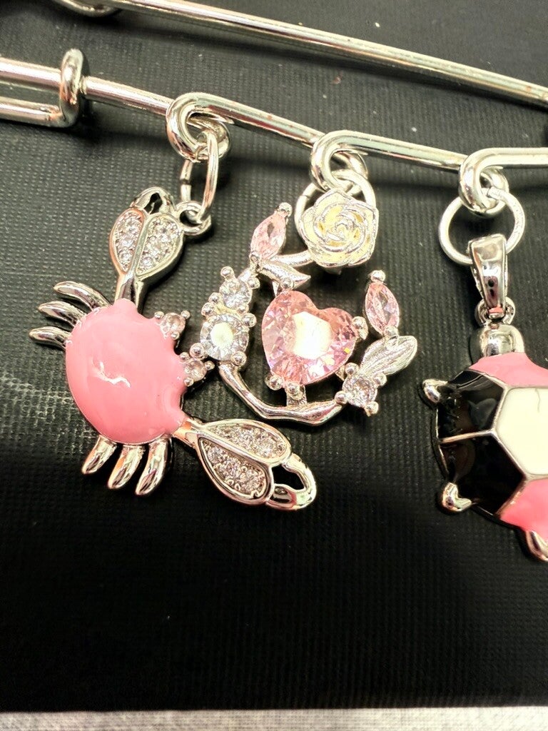 Bring the seaside to your style with our Coastal Charm Pin, a delightful mix of sparkle and ocean magic. This silver-tone pin features three playful pendants — a pink enamel crab with rhinestone claws, a shimmering heart framed in delicate floral details, and a black-and-coral turtle with glossy shell accents.