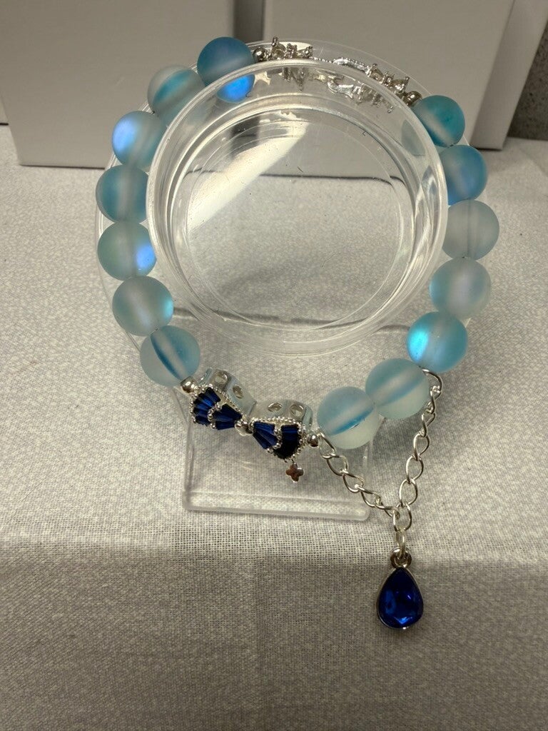 Glisten in every light with our Blue Elegance Bracelet, a dazzling mix of sophistication and serene beauty. This 6.25-inch stretch bracelet features radiant blue rainbow shimmer beads that glow like ocean light, accented with sparkling rhinestone bow spacers and a brilliant sapphire-blue teardrop charm.