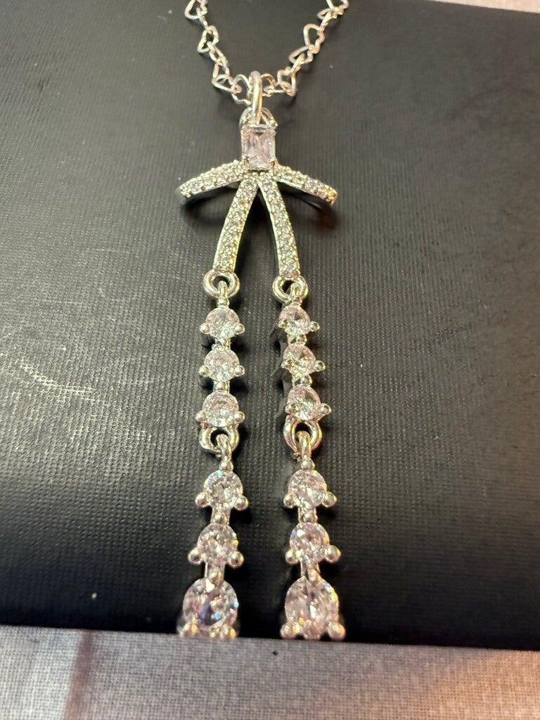 Elevate your look with our Radiant Elegance Set, a breathtaking duo of sparkle and sophistication. Crafted from genuine sterling silver, this set features an 18-inch chain with a cascading crystal drop pendant that shimmers beautifully with every movement. The matching earrings mirror the same graceful design — twin rows of brilliant stones that catch and reflect the light for a luxurious finish.