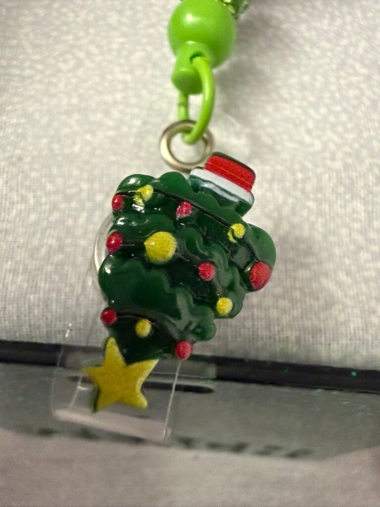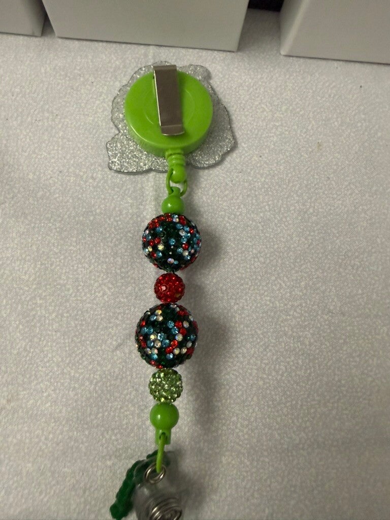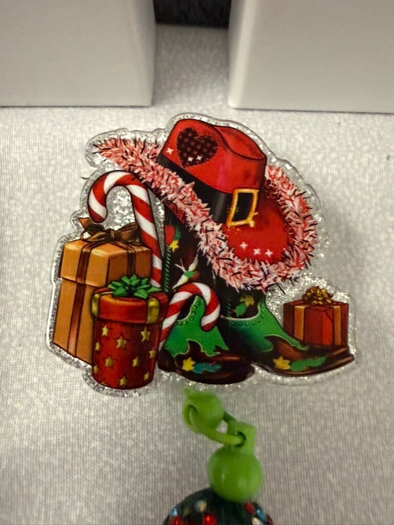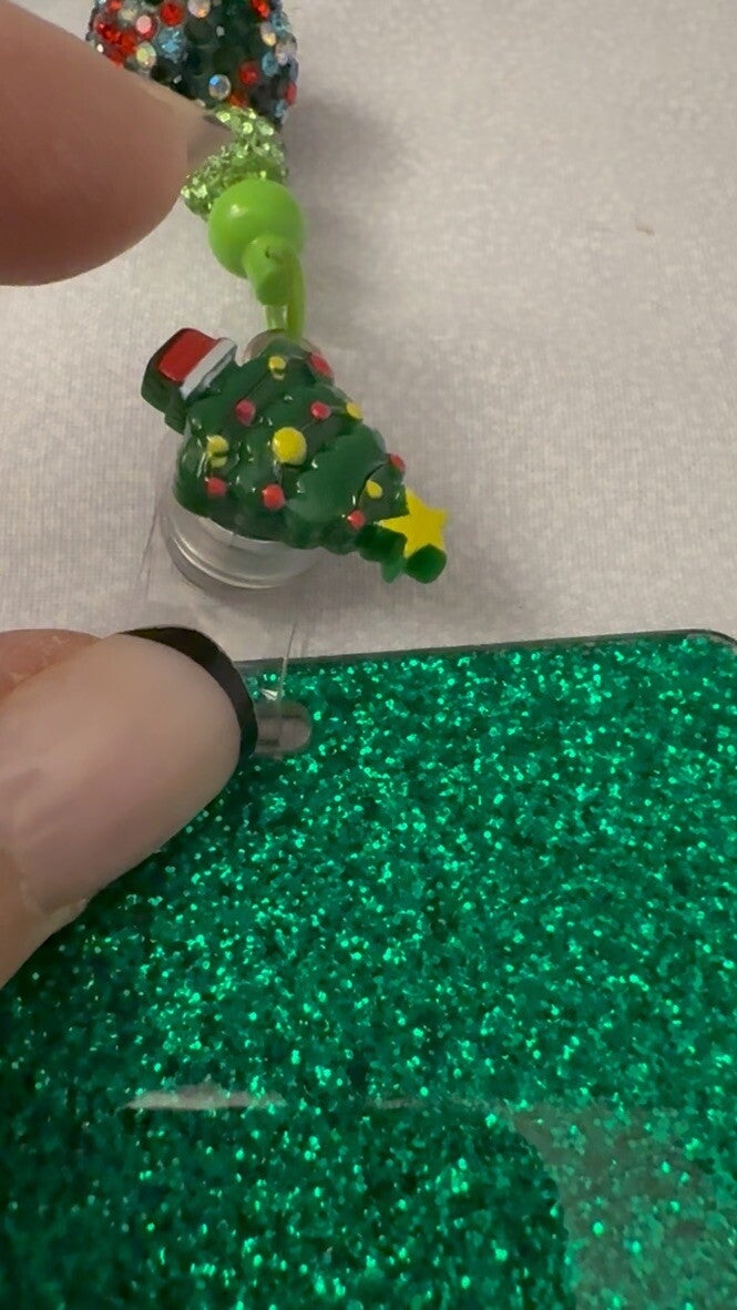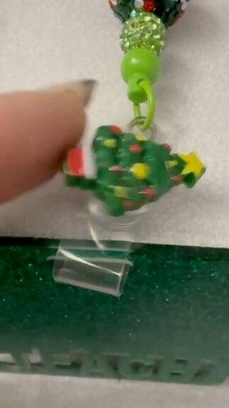 Featuring a holiday gnome holding presents, a strand of shimmering red, green, and multicolor rhinestone beads, and a tiny Christmas tree spinner charm, this reel captures everything we love about the holidays — sparkle, fun, and personality! The glittered green “TEACH” badge holder ties it all together, creating a complete seasonal statement piece that’s both practical and merry.