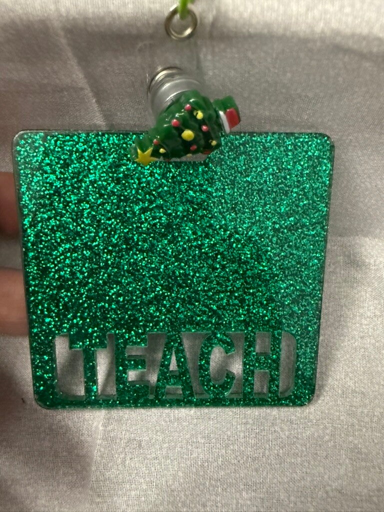 Sparkling green glitter “TEACH” badge holder for extra holiday flair