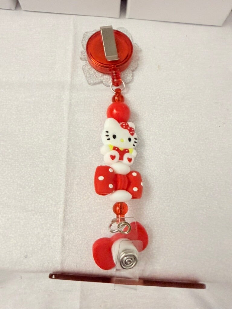 Handmade retractable badge reel with Hello Kitty-inspired topper