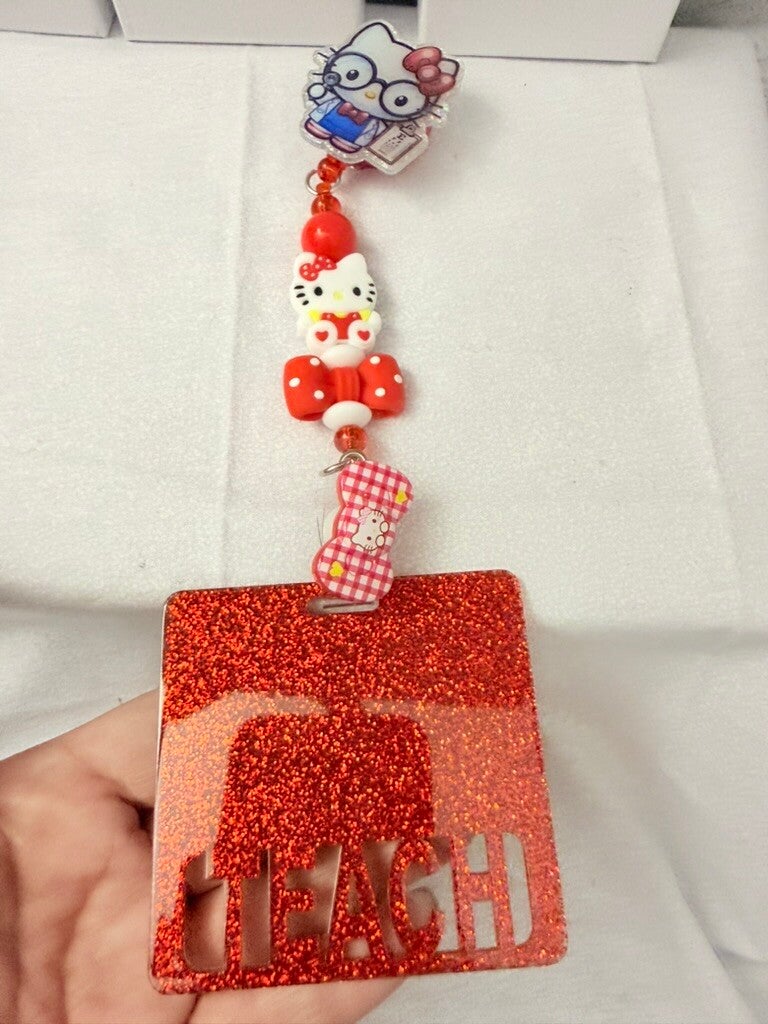 Add a pop of fun and sparkle to your school day with this handmade Hello Kitty-inspired badge reel and glitter TEACH holder! โจ Designed by Inspired Designs by KiKi, this adorable piece blends personality and practicality — perfect for teachers, staff, or anyone who loves to bring color and character to their work outfit.