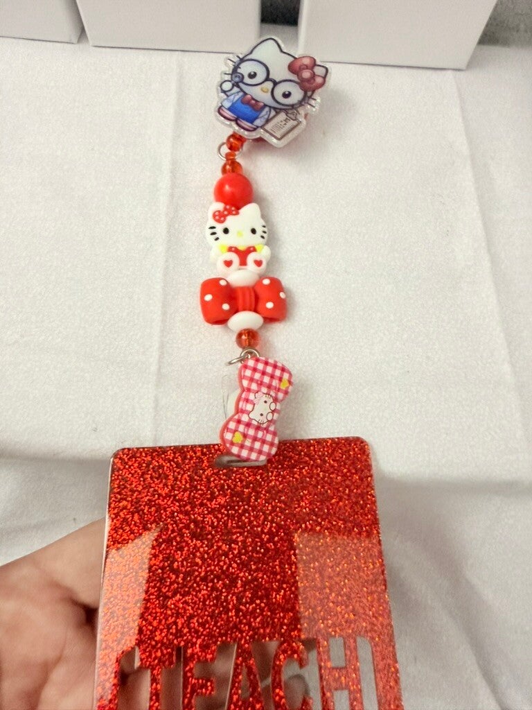 ๐ Hello Kitty Inspired Teacher Badge Reel with Red Glitter TEACH Holder โ Handmade Retractable ID Reel IDG100038