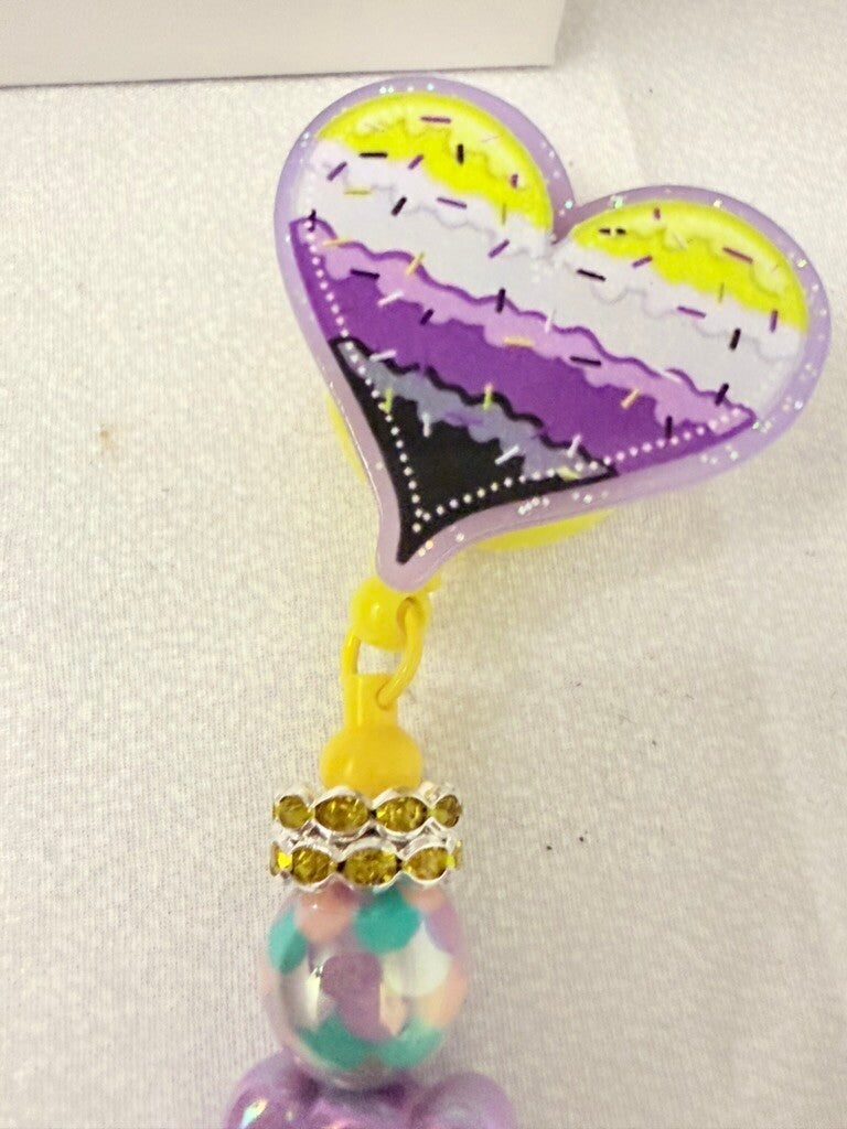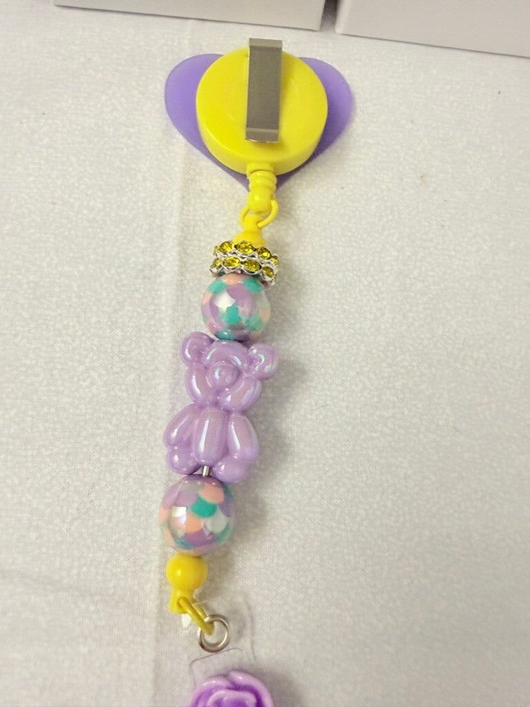 Bright, bold, and beautifully handmade — this Purple & Yellow Heart Badge Reel brings a perfect blend of style and positivity to your workday! ๐๐ Designed by Inspired Designs by KiKi, this handmade piece features a cheerful heart topper in pastel yellow and purple, paired with a lovely strand of floral and iridescent beads and finished with a lavender rose charm and marbled purple TEACH badge holder.