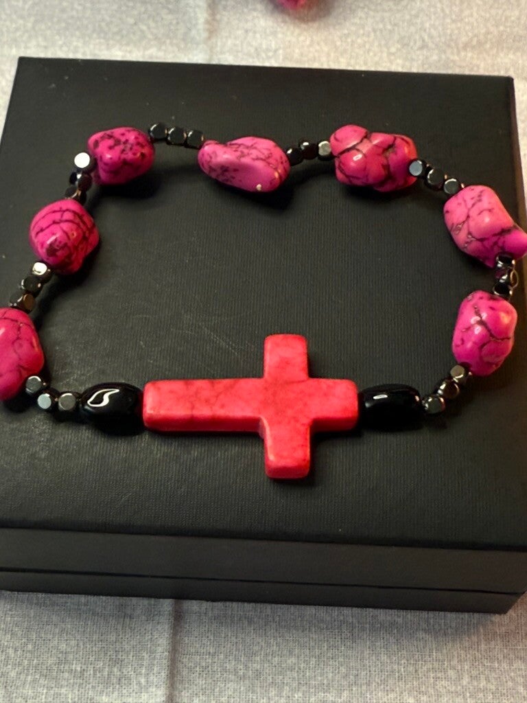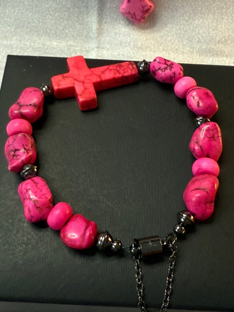 This handcrafted 3-piece set blends natural-style pink howlite stones with hematite accents and a touch of shine. The large cross pendant necklace exudes faith and confidence, while the matching bracelet features a bold side cross centerpiece with chain detail for an edgy finish. Complete the look with the coordinating dangle earrings, designed for modern, fearless style.