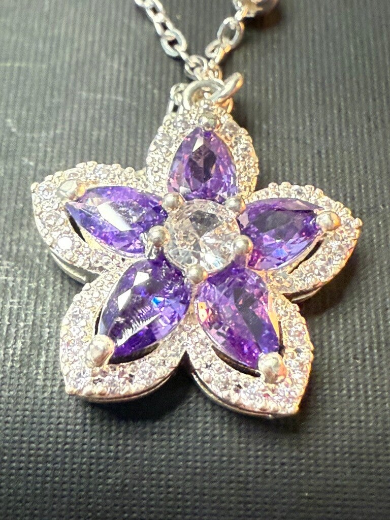 This handmade beauty features a delicate silver bead-accent chain and a dazzling five-petal flower pendant adorned with deep purple teardrop crystals and a brilliant clear center stone. Each petal is trimmed in micro-pave rhinestones for a luxurious, light-catching finish.