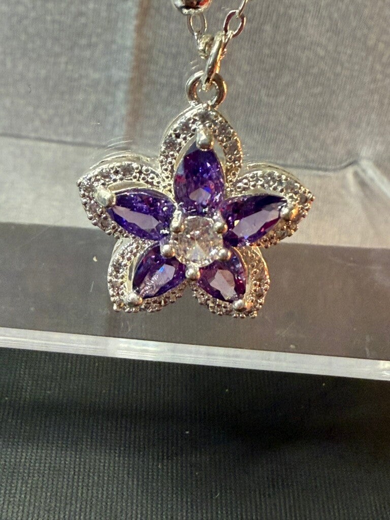 Purple Crystal Flower Necklace – Silver Chain with Sparkling Petal Pendant IDJ100012