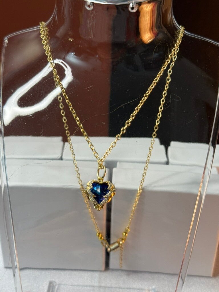 Blue Crystal Heart Layered Necklace – Gold Double Chain Pendant IDJ100014