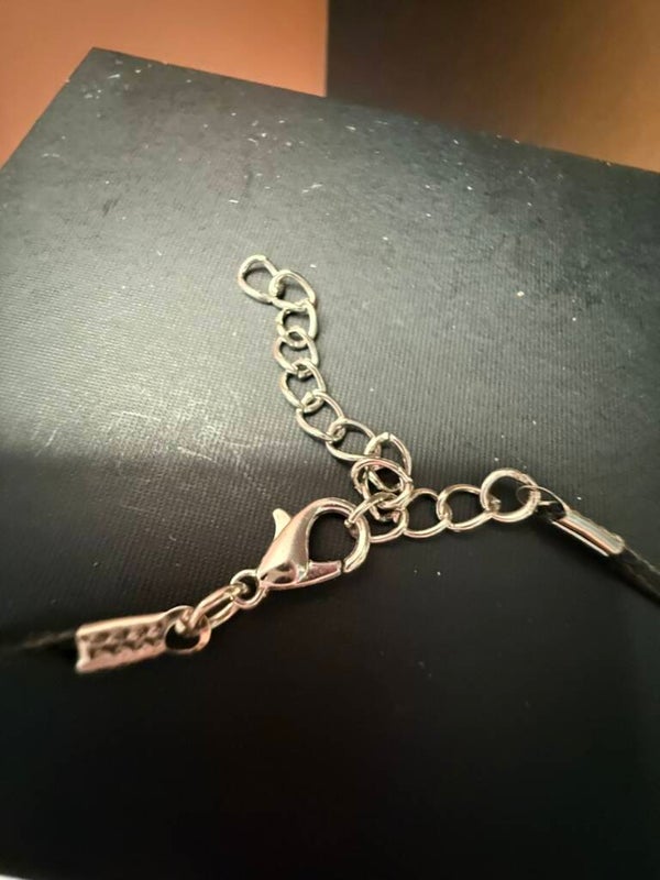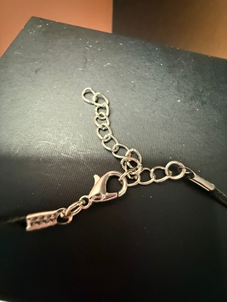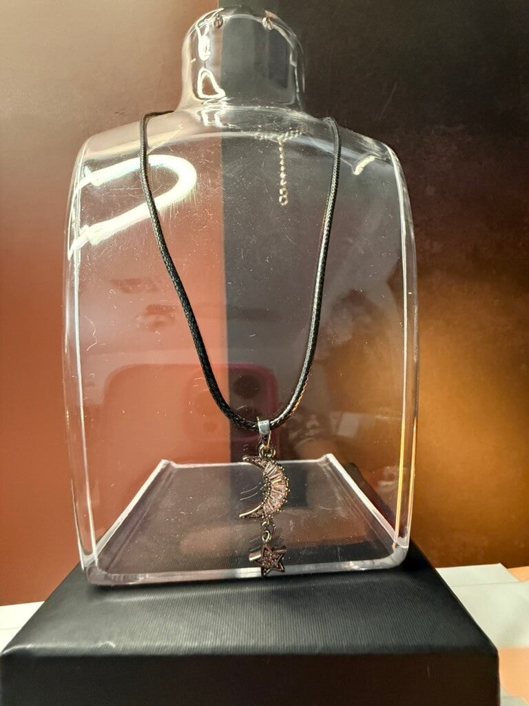 This piece features a shimmering crescent moon adorned with clear crystals and a dainty dangling star — beautifully suspended on a sleek black cord. The combination of silver tones and black leather creates a modern celestial aesthetic that’s both edgy and elegant.