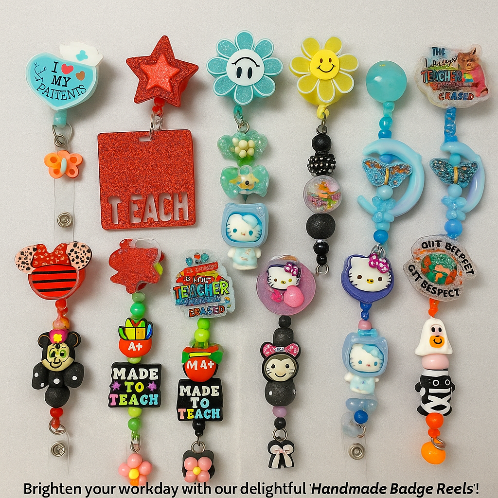 Bring personality and purpose together with our handcrafted badge reels—designed for professionals, teachers, and kids who love to accessorize with flair. Each reel is made by hand, bead by bead, blending color, creativity, and sturdy hardware for daily use. Whether you prefer elegant sparkle, cheerful characters, or playful themes, these reels make wearing your ID badge a little more fun.